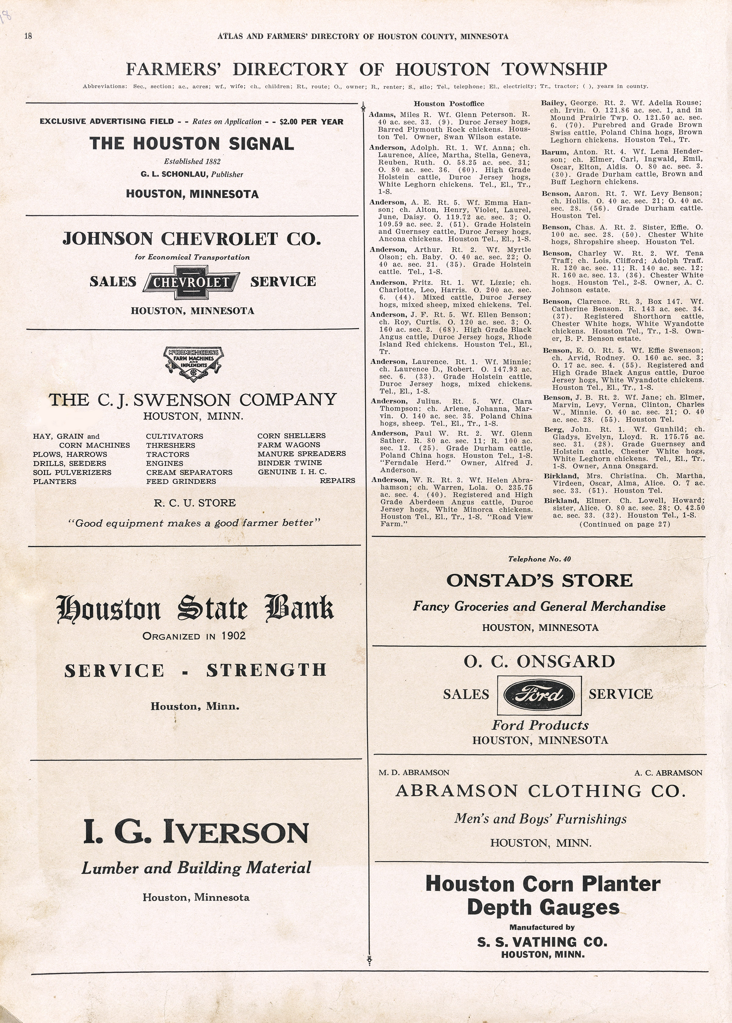 Farmers Directory of Houston Township, Houston County,